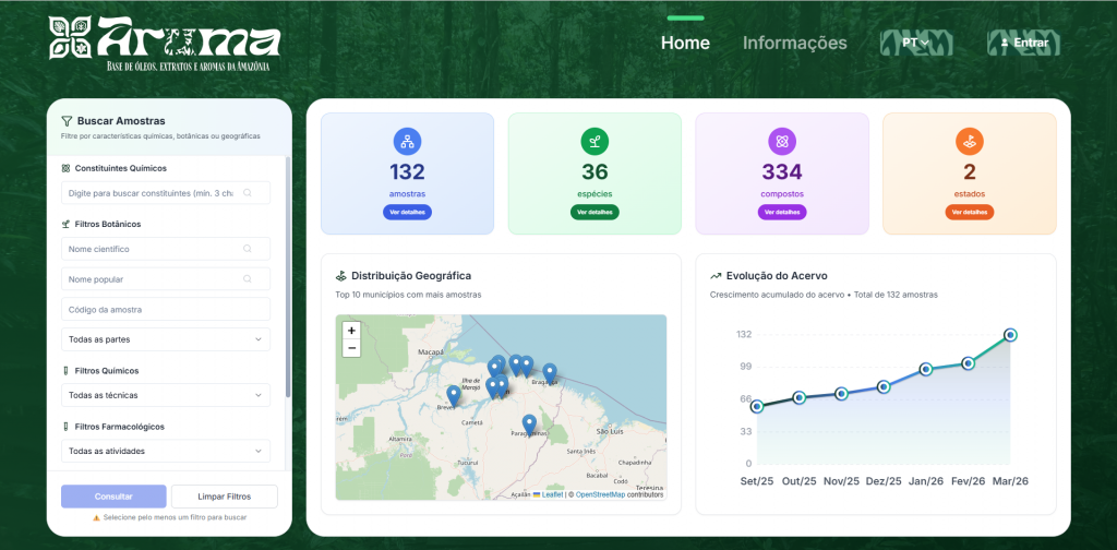 A partir desse esforço, nasceu a base de dados “Arúma”, um repositório único que reúne informações sobre a variabilidade química (volátil e não volátil) e genética (DNA barcode) das plantas aromáticas que ocorrem no bioma amazônico.