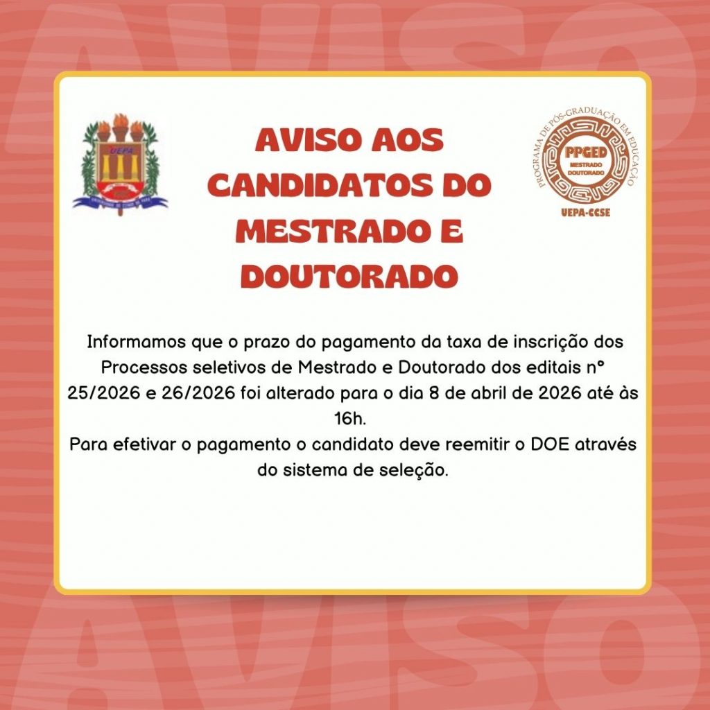 As datas de limite para o pagamento da Taxa de inscrição; Divulgação prévia das Inscrições Deferidas; Período de recurso do resultado das Inscrições; Divulgação do Resultado dos recursos do resultado das Inscrições; Divulgação final do resultado das Inscrições e Divulgação do local e horário da prova escrita, foram prorrogadas em virtude do feriado de Pascoa, as novas datas podem ser consultadas nas Erratas postadas neste site, na aba de Editais.