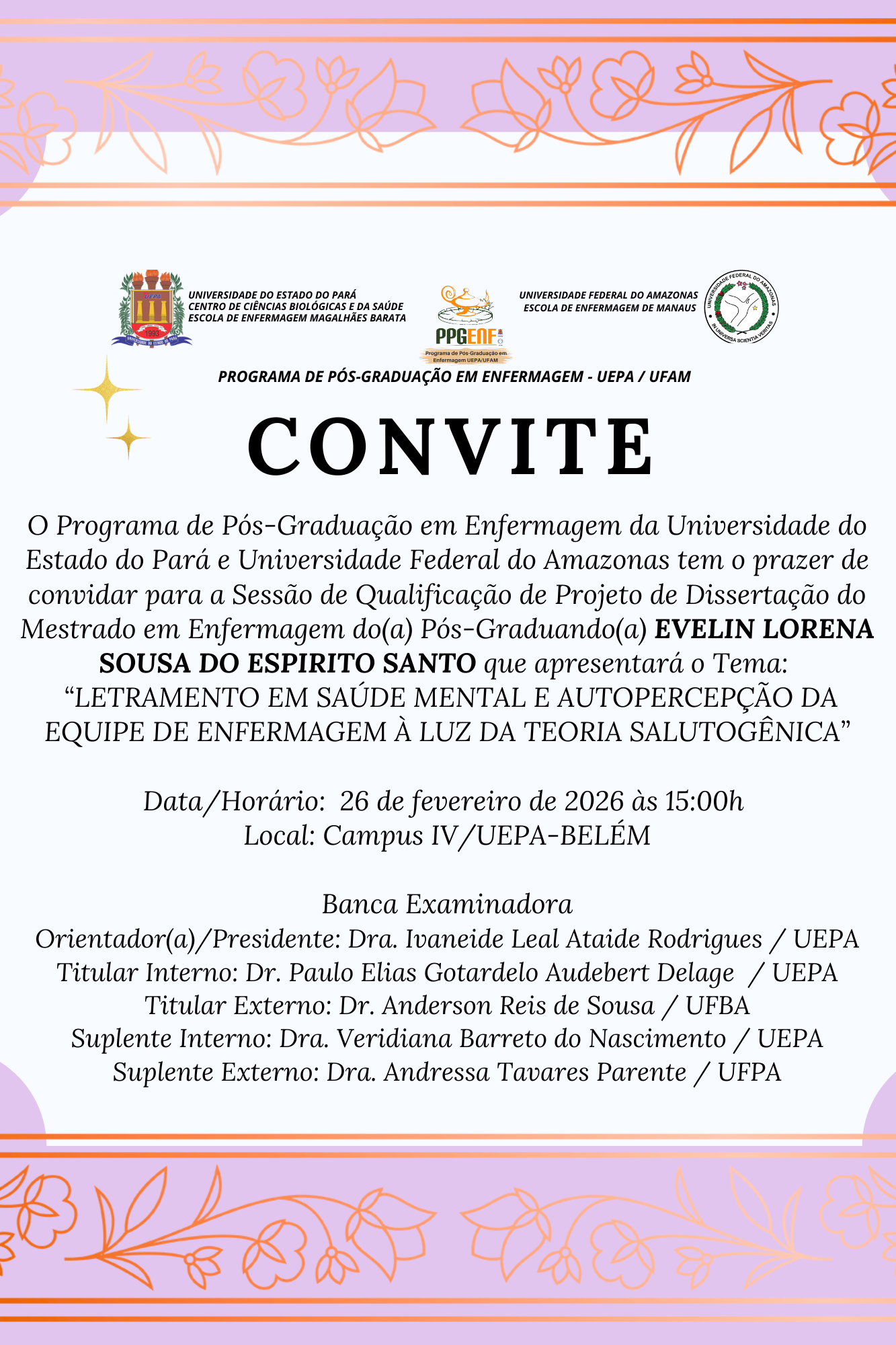 Dia 26 de janeiro/2026 às 15:00h – Discente EVELIN LORENA SOUSA DO ESPIRITO SANTO, acesse o CONVITE
